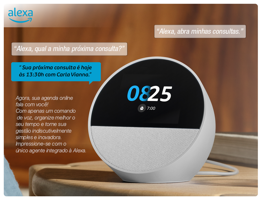 Sua agenda falando com você. Com a integração entre Alexa e Chattz, sua agenda ganha voz! Por meio de simples comandos, você pode consultar, organizar e gerenciar seus compromissos de forma ágil e prática. Tenha sua programação sempre à mão — ou melhor, na ponta da língua — e dedique mais tempo ao que realmente importa: cuidar de seus pacientes com ainda mais atenção e qualidade. Simplifique sua rotina e torne sua gestão indiscutivelmente eficiente!